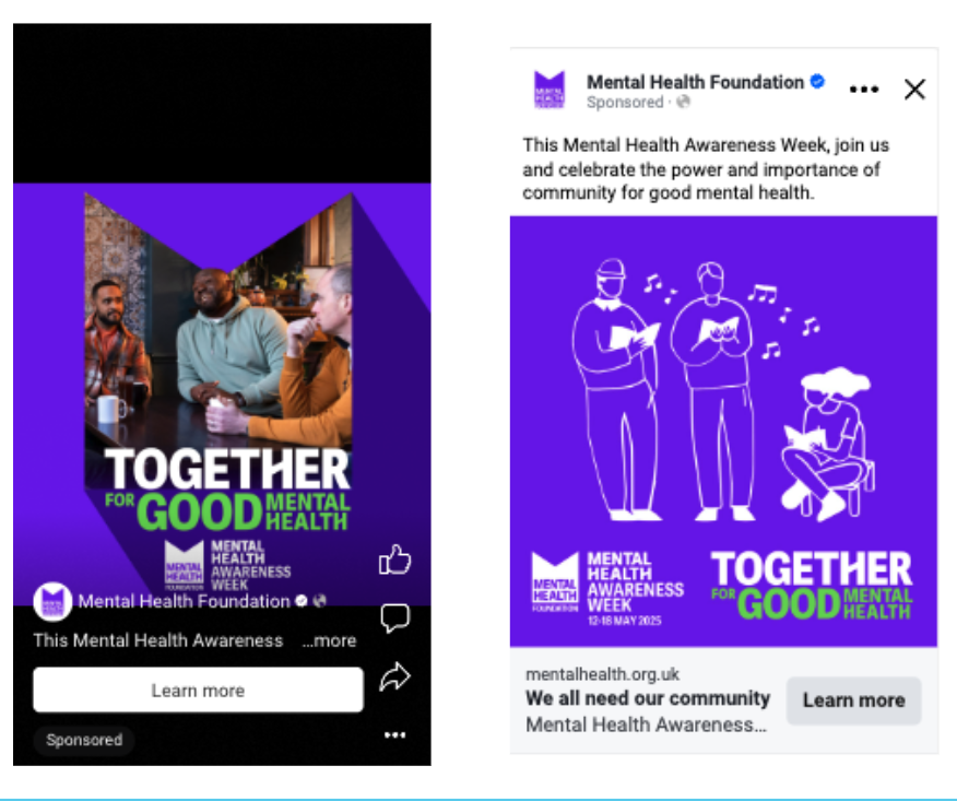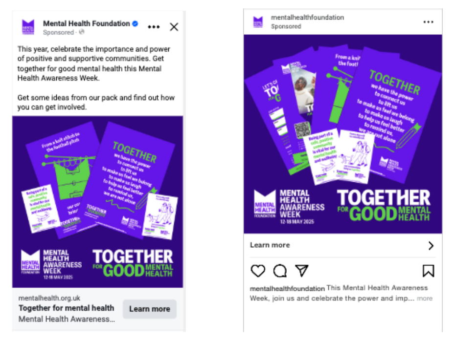 On Facebook and Instagram, we ran brand campaigns to drive people to the Mental Health Awareness Week landing page and encourage information pack downloads.