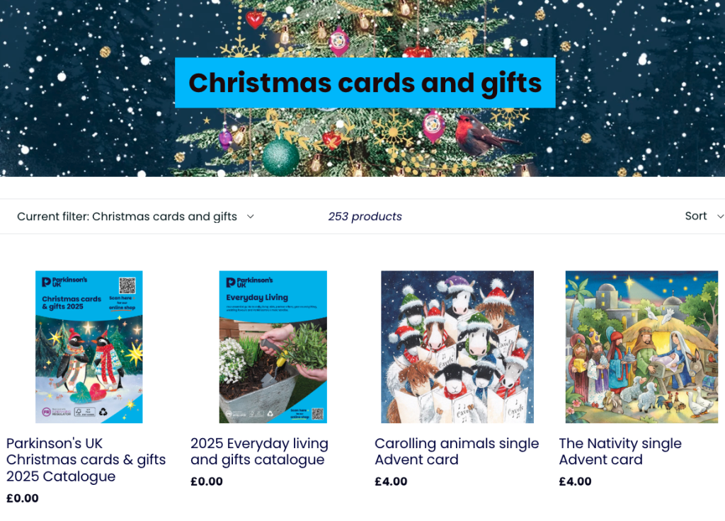 They run an online shop selling charity merchandise and a curated range of Christmas cards and gifts each year. All profits go directly to continue their work supporting everyone living with Parkinson’s and their families, friends and carers.