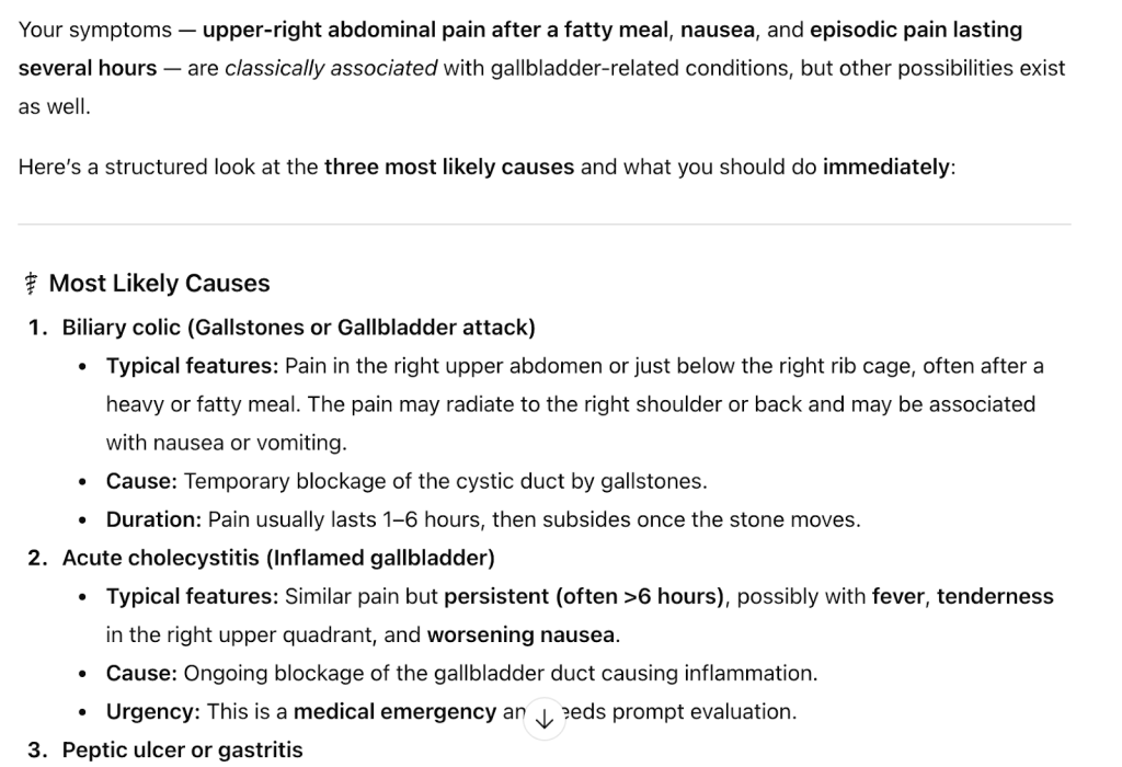 In this scenario, the UK charity GUTS was cited as a key source of information for this response, having a detailed page covering Gallstones and their symptoms and causes.