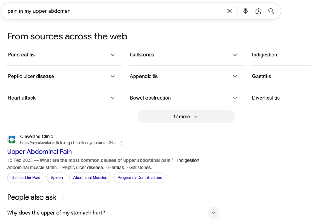 Previously, someone looking to understand a pain in their abdomen might have searched for “pain in my upper abdomen” and seen the following results: