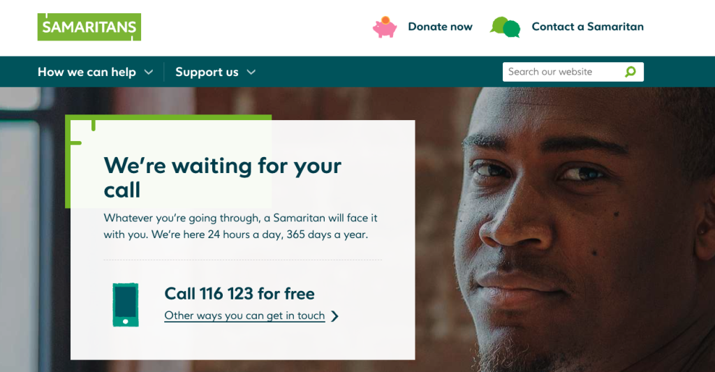 Samaritans provides emotional support to anyone in emotional distress, struggling to cope, or at risk of suicide throughout the United Kingdom and Ireland. Their services are free and available round the clock, 365 days a year.